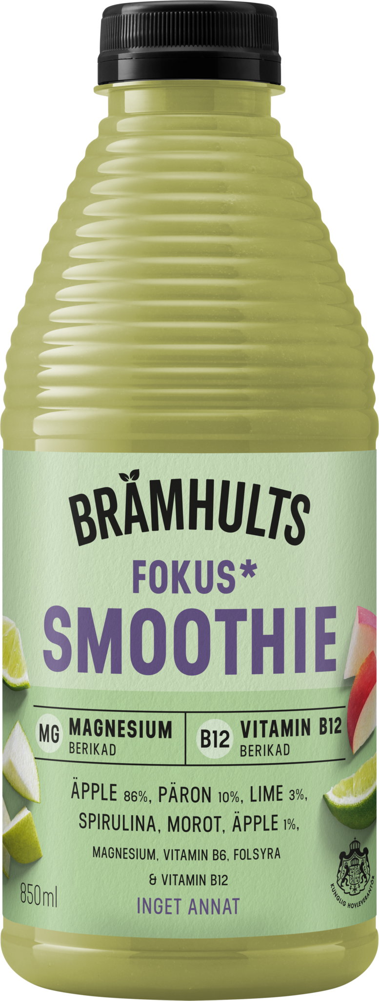 I smoothien Fokus är det extra allt av det som kroppen behöver och mår bra av! Förutom allt det goda från frukt och grönt har den fått extra tillskott av magnesium, vitamin B12 och koncentrat från bland annat algen spirulina. Välj Fokus för en hälsosam och mättande påfyllning. Brämhults smoothies innehåller inget tillsatt socker och är gjorda på 100 % frukt och grönt. Finns i storlek: 0,30 L & 0,85 L.
