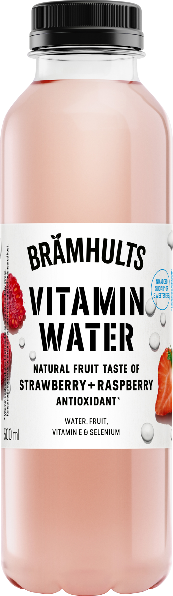 Brämhults Vitamin Water är ett funktionellt vatten med 20% frukt och adderade vitaminer, utan tillsatt socker eller sötningsmedel. Med sötma från jordgubbar och friskhet från hallon i en somrig kombination. Innehåller Selen och Vitamin E.